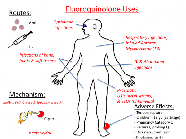 - 2016 FDA Warning: The FDA has determined that fluoroquinolones should be reserved for use in patients who have no other treatment options for infections because otherwise the risk of serious side effects (see below) generally outweighs their benefits (FDA Safety alert: 7/26/16).